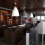 The art studio in this home redefines the traditional, providing a space that fosters creativity and artistic growth. Crafted by Forever Furniture, the unique shelving in the studio not only organizes and displays art supplies and pieces but stands as a work of art on its own. Modern workbench islands offer flexible spaces suitable for various creative pursuits. The space’s atmosphere is elevated by the dark walnut paneling, which brings a refined creative energy, harmonizing with the carefully crafted cabinetry and thoughtfully placed lighting throughout.