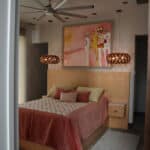 The owner’s suite features an ensuite bathroom that masterfully balances privacy with a sense of openness. A marble walk-in shower, framed by frameless glass on one side and a wall of reeded privacy glass from Sawyer Glass on the other, offers a secluded space that still captures natural light. A vanity wall elegantly sections off the bathroom from the bedroom, allowing for free flow around the areas. The bedroom itself is completed with custom-built furniture, integrating a headboard, drawers, and nightstands, adding to the suite’s blend of elegance and practical design in this personal sanctuary.